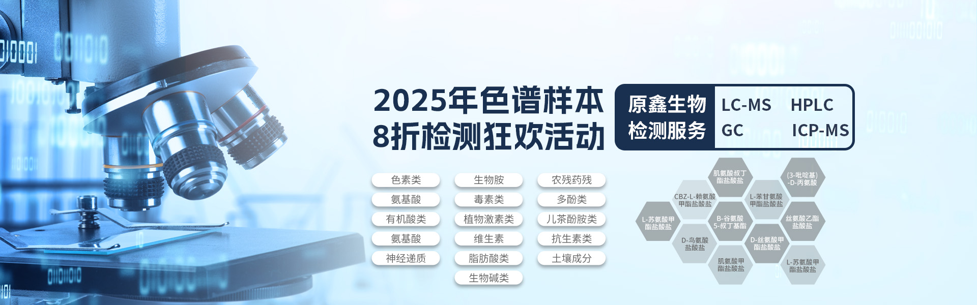 公司會提供一系列的檢測服務,例如液相色譜串聯質譜檢測、高效液相色譜檢測、氣相色譜檢測(GC)、生理生化檢測、ICP-MS檢測等等檢測服務,其中具體的檢測服務有抗生素類檢測、動物激素檢測、植物激素類檢測、短鏈脂肪酸類檢測、農藥殘留檢測、氨基酸類檢測等等